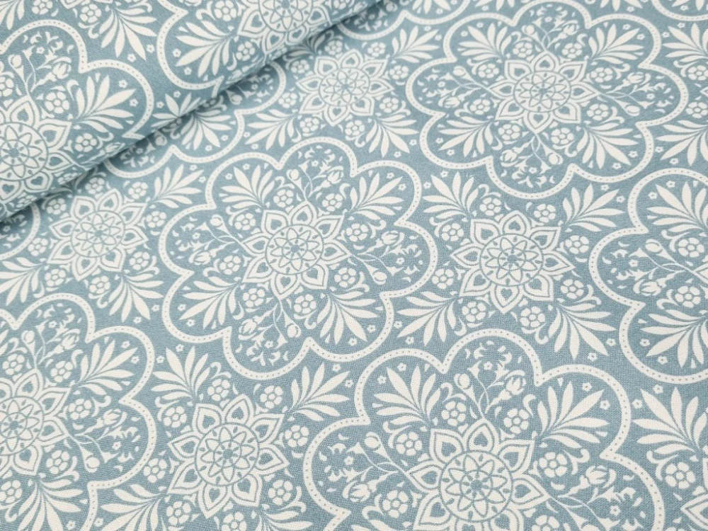 Bavlněné plátno - Mandaly šedomodré na krémově bílé