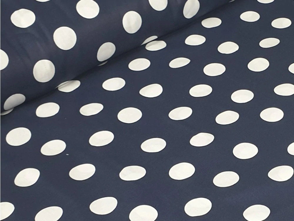 Bavlněné plátno - Puntík 2,5 cm na tmavě modréSkladem 20.6 m65 Kč/ m54 Kč bez DPH