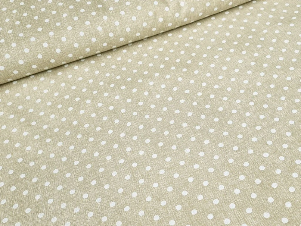 Bavlněné plátno - Puntík 6 mm na béžovém lněném efektuSkladem 11.9 m110 Kč/ m91 Kč bez DPH