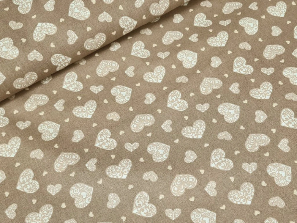 Bavlněné plátno - Srdíčka na světle hnědéSkladem 4.3 m105 Kč/ m87 Kč bez DPH
