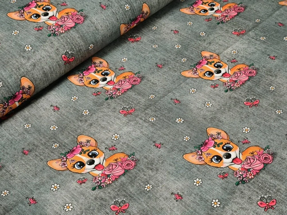 Elastická teplákovina DIGI - pejsci na šedém džínovém efektuSkladem 4.4 m255 Kč/ m211 Kč bez DPH