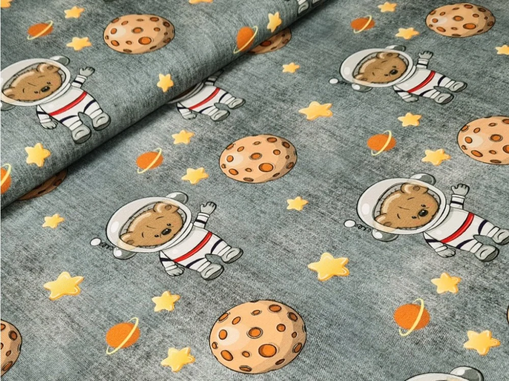 Elastická teplákovina DIGI - vesmír na šedém džínovém efektuSkladem 1.7 m250 Kč/ m207 Kč bez DPH